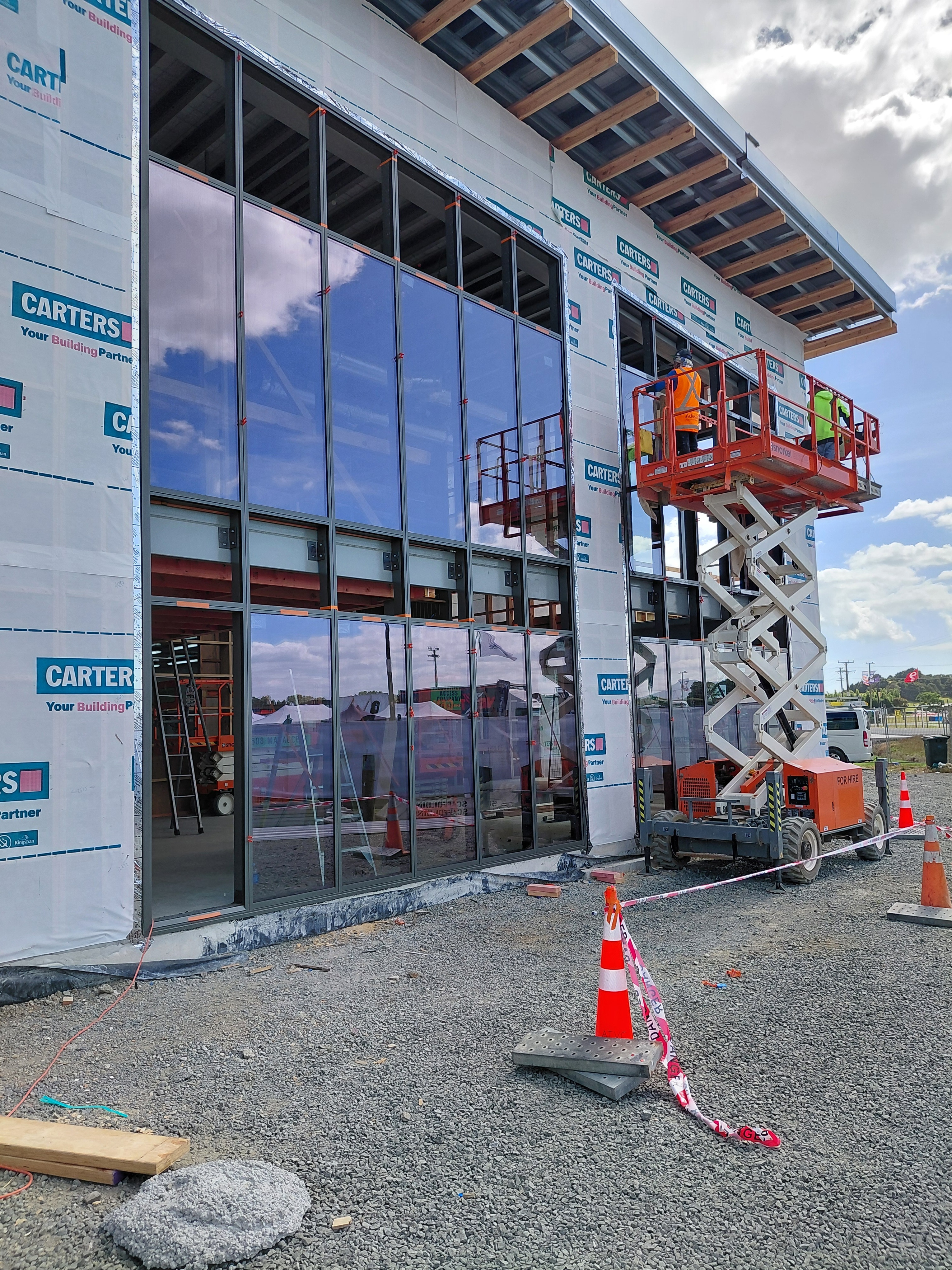 The main office structure is complete, with the curtain wall in place and glazing well underway. Inside, the new admin mezzanine and all partitioning are finished, while demolition makes way for the striking full height admin fire walls. Up next: external Indurabond cladding, first fix services, GIB linings, and the standout feature CLT stair.