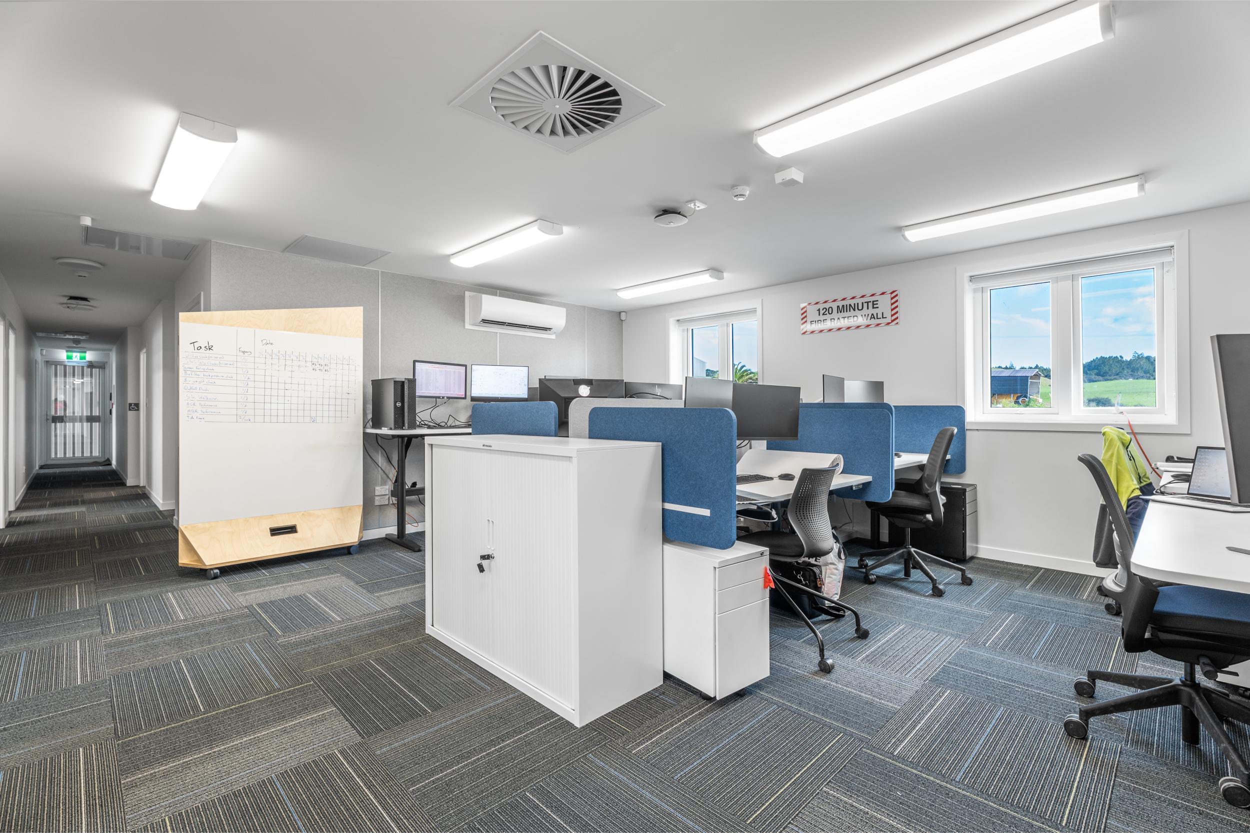 A 200m² modular industrial facility was delivered for Watercare Services Limited at the Snells Beach Wastewater Treatment Plant. Constructed off-site to minimise disruption and improve efficiency, the building includes offices, meeting rooms, a cafeteria, control room, laboratory, and bathrooms. Finished to a high standard, it provides a modern and functional space to support daily operations.